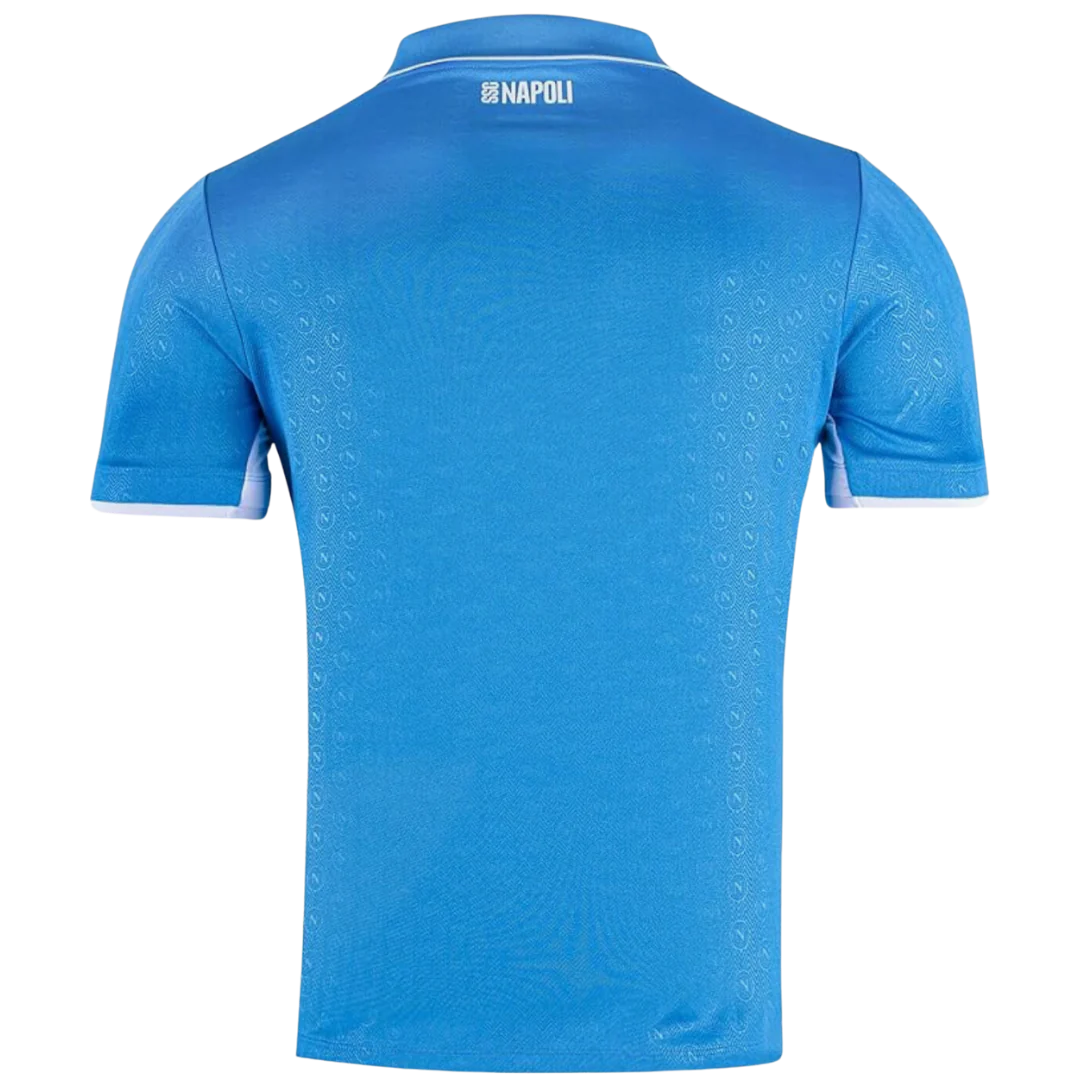 La maglia gara home della SSC Napoli per la stagione 2024/2025 si distingue per il suo elegante design e l'attenzione ai dettagli, celebrando la tradizione e l'innovazione del club partenopeo, rappresentando l'immagine istituzionale mettendo in primo piano l'azzurro Napoli e valorizzando le linee sobrie ed eleganti con particolari retró a partire dal collo a V con l'aggiunta della vela in costina smacchinata.
